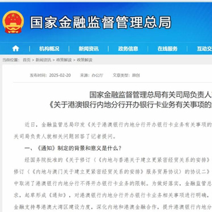 金融监管总局网站2月20日消息,金融监管总局近日印发《关于港澳银行内地分行开办银行卡业务有关事项的通知》,自2025年3月1日起实施。《通知》允许港澳银行内地分行开办外币银行卡业务等。