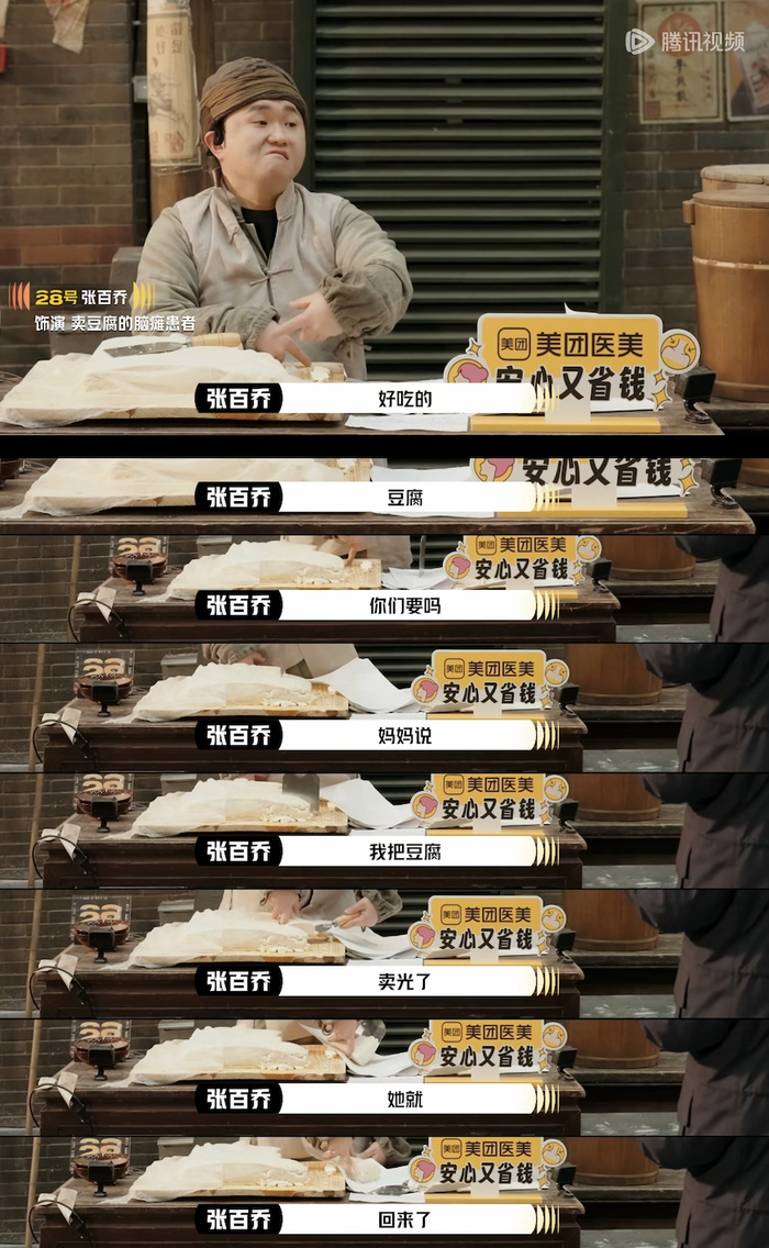 《演员请就位3》的参演演员多数都是行业内“腰部”及以下的小演员,各有各的职业和人生困境——28岁的张百乔长相并不出众,不多的“露脸”大都是在影视剧里演客串角色。十年前,他怀揣着表演梦,在北京跑组、试戏,但没什么好的机会,有时要干好几份工作养活自己。因此他干过编剧、现场导演、执行制片人,也做过自媒体博主,只是为了继续靠近表演。这次参加节目,他希望证明自己还能回到演员行列。在首期“表演之城”的群戏考核中,张百乔演了一位卖豆腐的脑瘫患者,他用扭曲的面部肌肉与含混不清的台词构建角色的形,用眼神里混杂的悲苦与高兴打动了导师也打动了观众。