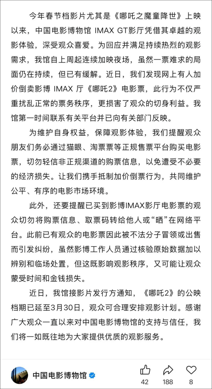 2月20日下午,中国电影博物馆发布郑重提示称,切勿轻信非正规渠道的购票信息,以免遭受不必要的经济损失。让我们携手抵制加价倒票行为,共同维护公平、有序的电影市场环境。