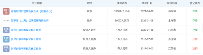 据天眼查,目前,白敬亭名下关联公司共有3家处于存续状态。其中,喆亭好(上海)品牌管理有限公司是由白敬亭创立的服装及生活方式品牌GOODBAI的母公司。白敬亭为第一大股东,持股41%,设计师上官喆为第二大股东,持股29%。