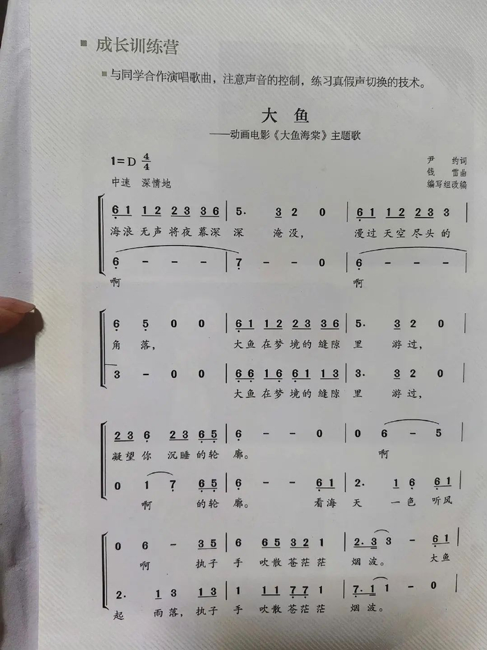 1.上海音乐出版社,六年级下册《大鱼》,七年级上册《灯火里的中国》,七年级下册《繁星璀璨的天空》。