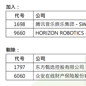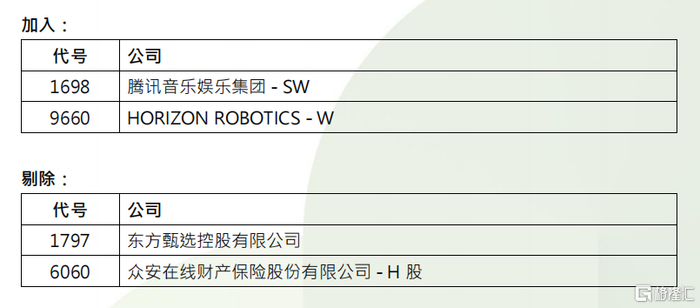 恒生科技指数调入腾讯音乐、地平线机器人,剔除东方甄选、众安在线,成份股数目维持30只。