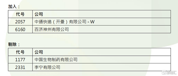 恒生中国企业指数调入中通快递、百济神州,剔除中国生物制药、李宁,成份股数目维持50只。
