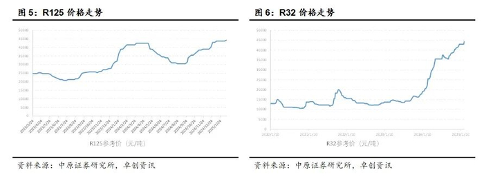 制冷剂景气有望延续,前瞻布局四代制冷剂。在蒙特利尔协议的推动下,我国的三代制冷剂从2024年开始实行配额制管理并逐步削减产量,发达国家2024年开始亦进一步削减三代制冷剂产能,推动行业供给收缩。在供给收缩和下游空调、冰箱等需求增长的推动下,三代制冷剂价格自2024年初以来持续上涨,行业景气不断上行。根据卓创资讯数据,目前制冷剂R32、R125、R134a价格分别为44500、44250和44500元/吨/,较2024年初上涨150.70%、59.46%和60.36%。公司是我国三代制冷剂行业龙头,配额位居国内第一。受益于制冷剂行景气的提升,2024年公司预计实现净利润18.7-21亿元,同比提升98%至123%。未来制冷剂行业供给格局保持稳定,在需求增长的推动下,行业景气有望延续。