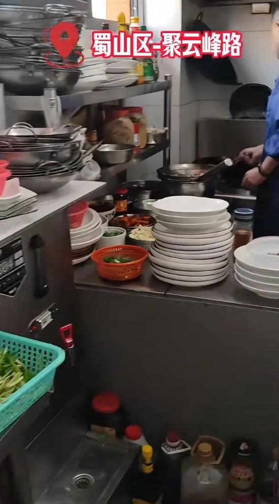 屋内的场景更是让我大吃一惊,那是一个6平米左右的厨房,可却挤了4家外卖店,由于位置过于狭小,甚至没有洗菜池。倘若商家们想洗菜,他们只能去公共厕所洗,但不一定每个商家都会洗菜,忙起来时,菜来不及洗就下锅炒了。