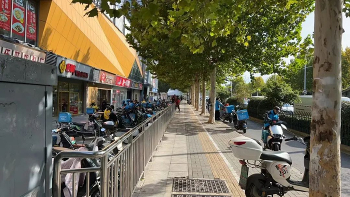 刚开始做挑战的时候,南京还很热,我早上10点出门,在五塘广场附近的商城转悠,好不容易看到一个在小电驴上小憩的外卖员,我鼓起勇气,拿着钞票问他:“给你100块钱,你能不能带我去一家干净外卖馆子吃饭”。