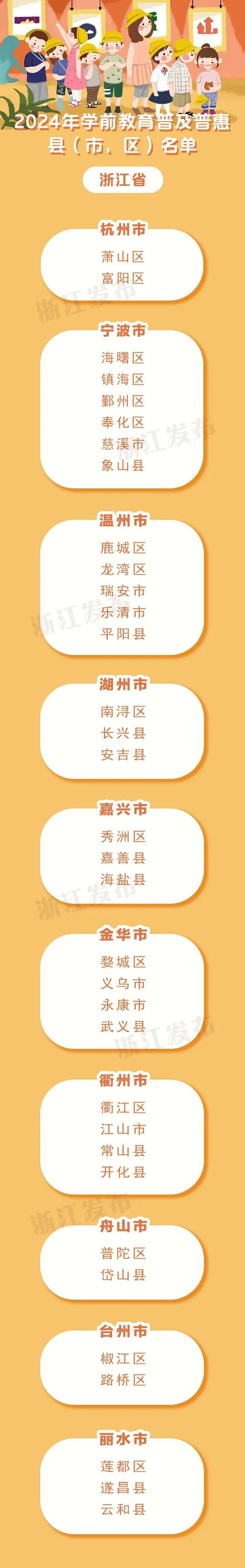 教育部近期公布了2024年学前教育普及普惠县(市、区)名单,全国共301个,其中宁波也有6个:海曙区、镇海区、鄞州区、奉化区、慈溪市、象山县。
