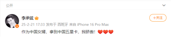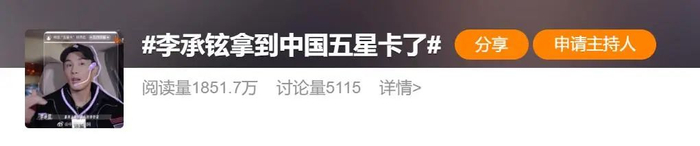 2月21日,“李承铉拿到中国五星卡了”等一系列词条登上微博热搜。