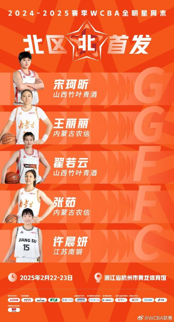北区首发名单是王丽丽、张茹、宋珂昕、翟若云、许晨妍。本赛季WCBA常规赛已经结束,排名第二的内蒙古女篮和排名第四的山西女篮各有2名球员入选全明星正赛北区首发阵容。