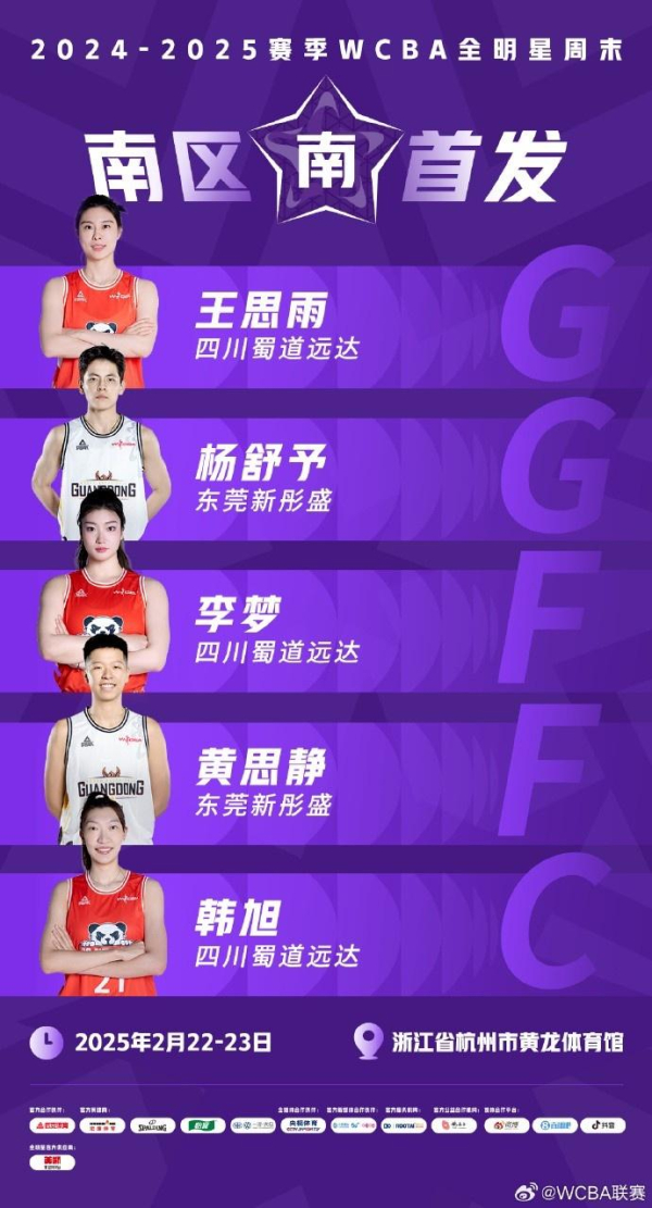 南区首发名单是李梦、韩旭、王思雨、杨舒予、黄思静,其中3人来自四川女篮,2人来自东莞女篮。四川队本赛季31胜1负的战绩,以较大优势收获常规赛冠军,东莞女篮排名第三。
