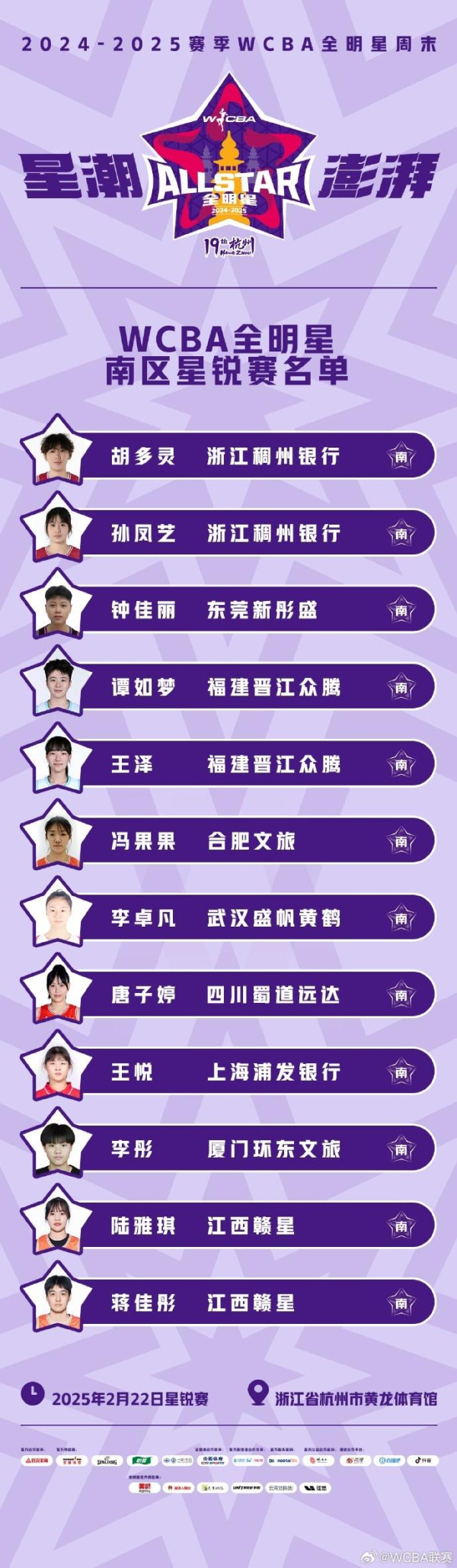 2024-2025赛季WCBA全明星周末开赛在即,2月22日19点30分率先上演星锐赛,全明星正赛将于2月23日19点举行。另外,三分球大赛和技巧挑战赛的预赛都将在22日星锐赛中场进行,决赛在23日全明星正赛中场进行。