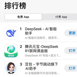 今日,腾讯旗下首个AI原生APP元宝超越豆包,升至中国区苹果免费APP下载排行榜第二。Deepseek继续位居榜首。