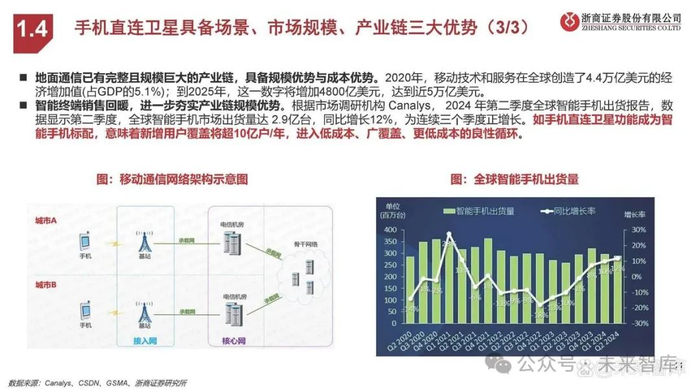 地面通信已有完整且规模巨大的产业链,具备规模优势与成本优势。2020年,移动技术和服务在全球创造了4.4万亿美元的经济增加值(占GDP的5.1%);到2025年,这一数字将增加4800亿美元,达到近5万亿美元。智能终端销售回暖,进一步夯实产业链规模优势。根据市场调研机构 Canalys, 2024 年第二季度全球智能手机出货报告,数据显示第二季度,全球智能手机市场出货量达 2.9亿台,同比增长12%,为连续三个季度正增长。如手机直连卫星功能成为智能手机标配,意味着新增用户覆盖将超10亿户/年,进入低成本、广覆盖、更低成本的良性循环。