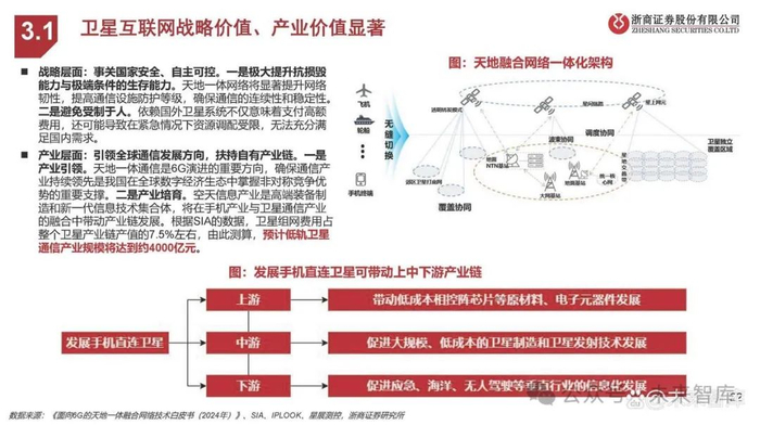 战略层面:事关国家安全、自主可控。一是极大提升抗损毁 能力与极端条件的生存能力。天地一体网络将显著提升网络 韧性,提高通信设施防护等级,确保通信的连续性和稳定性。 二是避免受制于人。依赖国外卫星系统不仅意味着支付高额 费用,还可能导致在紧急情况下资源调配受限,无法充分满 足国内需求。