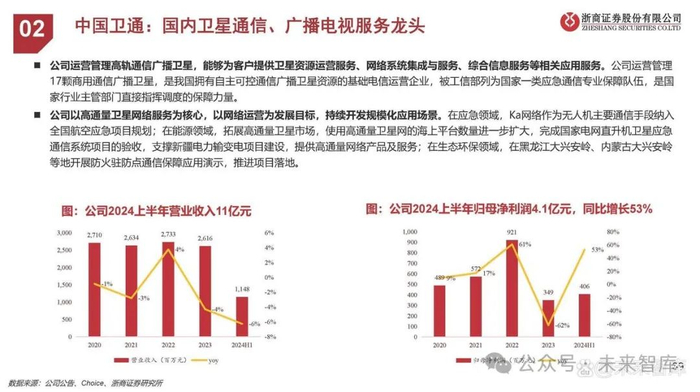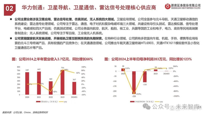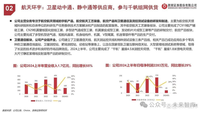 卫星通信板块,公司产业链齐全。公司建立了卫星通信天线、航天测运控天线和特种测试设备三条产品线,相关产品已成功应用在多个军兵种的卫星通信地面站、卫星测控站、靶场测控站、侦收站等装备上,以及在国家低轨卫星互联网信关站、大型紧缩场测试系统等领域,取得了长足的技术进步和良好的市场品牌效应。2024上半年,公司主要完成了“千帆”星座4.5米测控天伺馈、“千帆”星座1.8米馈电天伺馈、大尺寸静区紧缩场反射面等产品的研制交付。