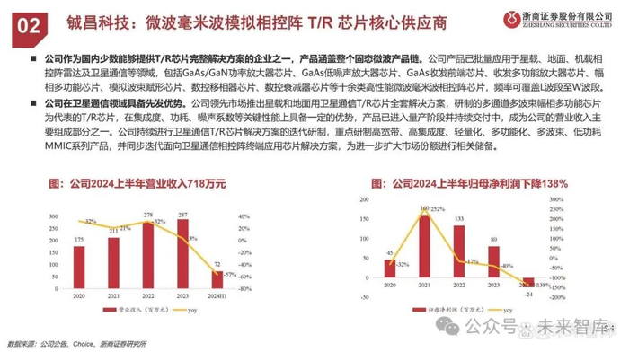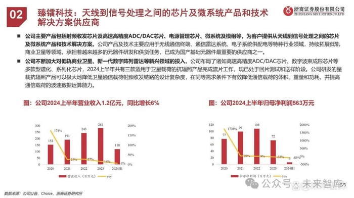 公司在低轨卫星和商业航天领域均开展了技术研发和产品开发工作,多款产品已开始交付客户。公司已开展卫星通信领域多个射频集成电路的技术研发和产品开发工作,多款产品已被客户引入。多款射频集成电路已应用于5.5G通感一体基站中。应用于基站新一代智能天线的高线性控制器件业务批量供货,并针对5.5G通信的发展需求持续进行产品迭代开发和新产品研发。应用于无人机的射频前端模组批量出货,下一代高性能射频前端模组已完成样品研制工作。