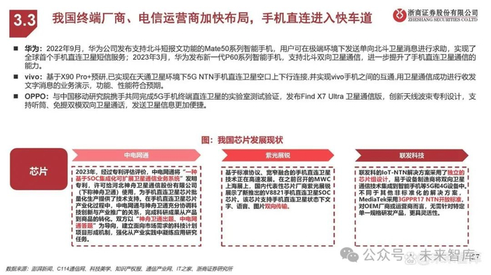 华为:2022年9月,华为公司发布支持北斗短报文功能的Mate50系列智能手机,用户可在极端环境下发送单向北斗卫星消息进行求助,实现了全球首个手机直连卫星短信服务;2023年3月,华为发布新一代P60系列智能手机,支持北斗双向卫星通信,进一步提升了手机直连卫星通信的能力。 vivo:基于X90 Pro+预研,已实现在天通卫星环境下5G NTN手机直连卫星空口上下行连接,并实现vivo手机之间的互通,用卫星通信成功进行收发文字消息的业务演示,功能、性能符合预期。 OPPO:与中国移动研究院携手共同完成5G手机终端直连卫星的实验室测试验证,发布Find X7 Ultra 卫星通信版,创新天线波束专利设计,支持听筒、免提双模双向卫星通话,发送卫星信息更加便捷。