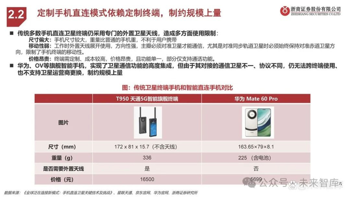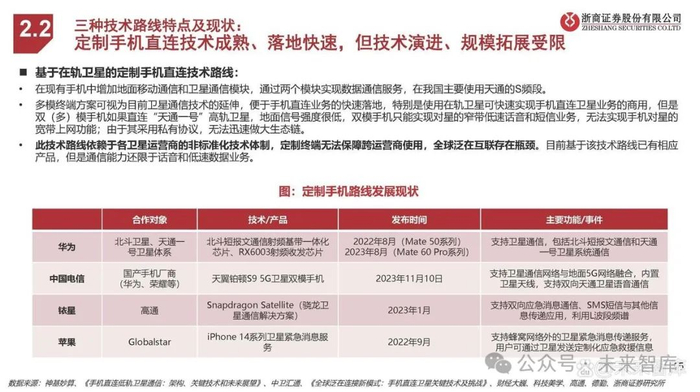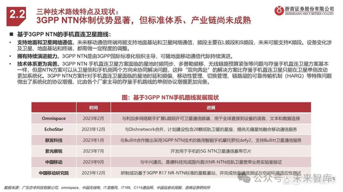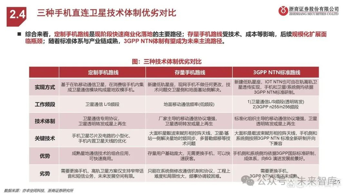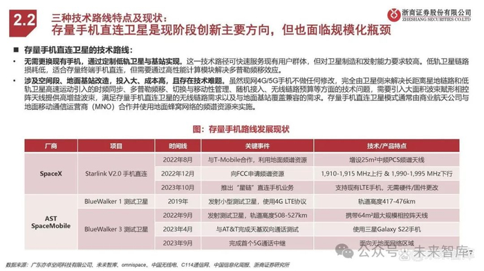 三种技术路线特点及现状: 定制手机直连技术成熟、落地快速,但技术演进、规模拓展受限