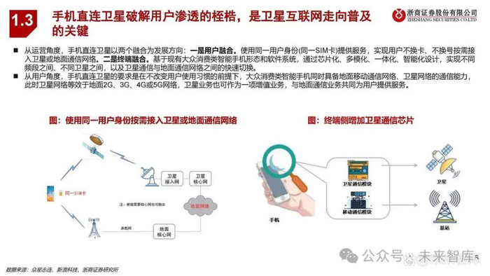从运营角度,手机直连卫星以两个融合为发展方向:一是用户融合。使用同一用户身份(同一SIM卡)提供服务,实现用户不换卡、不换号按需接入卫星或地面通信网络。二是终端融合。基于现有大众消费类智能手机形态和软件系统,通过芯片化、多模化、一体化、智能化设计,实现不同频段之间、不同卫星之间,以及卫星通信与地面通信网络之间的快速切换。 从用户角度,手机直连卫星的要求是在不改变用户使用习惯的前提下,大众消费类智能手机同时具备地面移动通信网络、卫星网络的通信能力,此时卫星网络等效于地面2G、3G、4G或5G网络,卫星业务也可作为一项增值业务,与地面通信业务共同为用户提供服务。