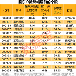 金智科技股东户数降幅最高,截至2月20日,公司共有5.42万户股东。公司近期接受投资者调研活动表示,近年来,公司围绕“双碳”、“数字经济”战略,持续聚焦主营业务,强化内部管理,先后处置了多项非主营业务资产,收回了较为充裕的现金流,优化了公司的资产结构,降低了公司的资产负债率,有效控制了公司的经营风险,公司经营利润实现良好增长。