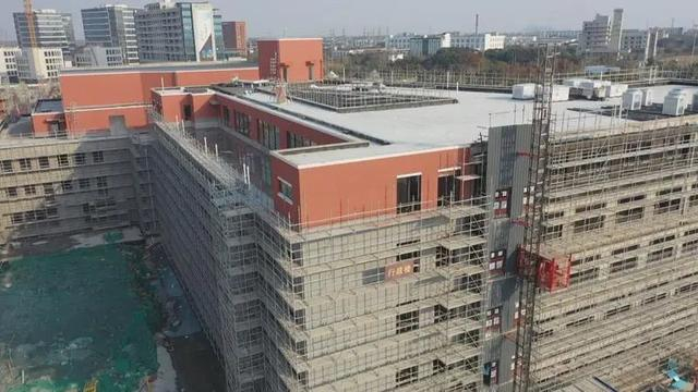 从空中俯瞰,华二金山实验学校新建工程一期主体结构楼体红色基调初现。据了解,一期项目外立面装修已开始施工,采用“水包砂多彩漆”工艺,已完成总工程量的35%,同时,一期的内部装饰、水电管线、墙面地面等已完成总工程量的40%。