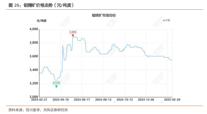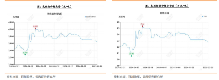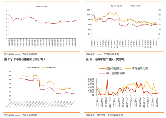 海外矿:1)Lynas:24Q4公司REO总产量为2617吨,环比-3.9%,同比+67.1%;氧化镨钕总产量为1292吨,环比-23%,同比+43.4%。2)MtPass:24年Q3稀土氧化物总产量为13742吨,环比+51.3%,同比+27.6%。