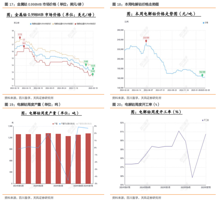 电解钴综述:本周(2025.2.14-2025.2.20)国内金属钴行情偏稳运行,截至2月20日,百川盈孚统计99.8%电解钴价格15.0-17.5万元/吨,较上周同期均价不变。本周国内电子盘钴价震荡区间小幅调整,电解钴整体报价维稳。周内电解钴市场货源十分充足,可流通量较大。尽管下游处于缓慢复工状态,但市场询盘热度与活跃度均较为平淡,短期现货价格偏弱势运行。