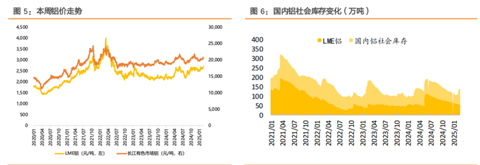 综述:本周(2025.2.14-2025.2.20)铝价上涨。本周外盘铝均价为2648美元/吨,较上周相比上涨12美元/吨,涨幅0.46%。沪铝主力均价20720元/吨,较上周相比上涨115元/吨,涨幅0.56%。华东现货均价为20588元/吨,与上周相比上涨84元/吨,涨幅0.41%。华南现货均价为20580元/吨,与上周相比上涨56元/吨,涨幅0.27%。海外政策频频,外盘铝价上行带动,叠加国内宏观情绪尚可,新能源汽车数据继续向好,本周现货铝均价小幅上涨。
