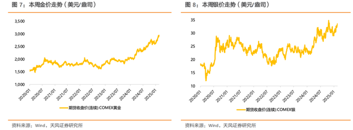 贵金属:持续定价通胀,金银价格上涨。截至2月20日,国内99.95%黄金市场均价683.30元/克,较上周均价上涨0.75%,上海现货1#白银市场均价8052元/千克,较上周均价上涨0.69%。周初,美国1月PPI同比增幅为近两年新高,但与PCE通胀相关部分显温和,金银价格窄幅波动。而后,美国总统特朗普表示,俄罗斯总统普京和乌克兰总统泽连斯基都希望尽快结束俄乌冲突,令避险情绪有所减弱,同时受多头获利了结拖累,COMEX黄金主力最高下跌至2893.7美元/盎司附近,沪金主力价格下跌至677.10元/克附近。美联储重申不急于降息的纪要并未给市场带来很大冲击,特朗普关税计划的不确定性仍引发了对经济增长的担忧,避险属性仍未金银价格提供支撑,当前COMEX金银主力分别运行在2950-3000和33.0-33.5美元/盎司之间,沪银在8100-8200元/千克区间内窄幅震荡,沪金主力在688元/克附近徘徊。建议关注:招金矿业、山金国际、山东黄金、中国黄金国际、湖南黄金、株冶集团。