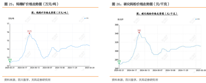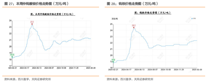 综述:本周(2025.2.13-2025.2.20)钨价下调。截止到2月20日,65度黑钨精矿均价在14.4万元/吨,较上周下调0.1万元/吨;仲钨酸铵在21.2万元/吨,较上周下调0.05万元/吨,70钨铁均价在21.9万元/吨,较上周持平,碳化钨粉在311.5元/千克,较上周下调1元/千克。随着国内出口管制政策施行,国内企业对后市预期分歧,部分业者购销积极性下降,市场参与者交投谨慎,场内观望情绪浓厚。短期钨矿端供给弹性不足,消费端采买需求有限,市场基本面多空持续博弈,55%黑钨精矿价格报14.2万元/标吨,市场供应状态有所恢复,但是实际需求跟进不足,市场多空分歧增加,近期成交行情相对承压。