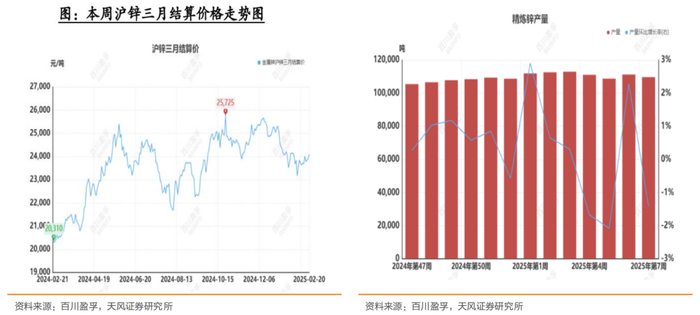 综述:本周(2025.2.14-2025.2.20)锌价震荡偏强。截止到2月20日,0#锌锭现货周均价23886元/吨,较上周平均涨幅0.42%。锌市喜忧参半,海外美联储会议纪要表明对特朗普政策的潜在影响,包括但不限于对通胀上升的担忧,国内则呼吁民营企业参与“两重两新”政策,改善市场情绪。矿端宽松预期增强,年后锌锭社会库存持续累增,下游消费复苏程度缓慢,现货升水下滑。由此可见多重因素扰动下,周内锌价暂未形成单边走势,以宽幅震荡为主。