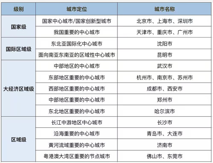 2035版总规显示,杭州、南京、苏州为“东部地区重要的中心城市”,武汉为“中部地区的中心城市”,郑州为“中部地区重要的中心城市”,成都、西安为“西部地区重要的中心城市”,哈尔滨为“东北地区重要的中心城市”。此外,位于东北地区的沈阳被定位为“东北亚国际化中心城市”,位于西部地区的昆明被定位为“面向南亚东南亚的区域性中心城市”,二者是区域中心城市中仅有两个面向国际的城市。