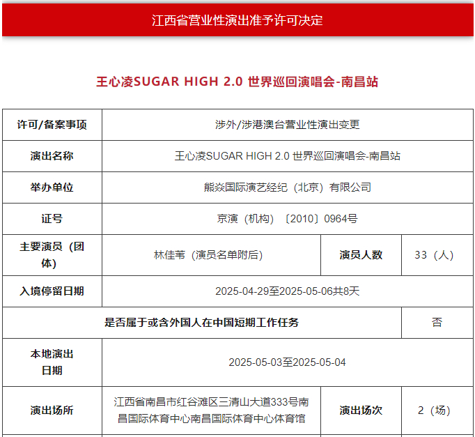 据公开信息显示,王心凌Sugar High2.0世界巡回演唱会南昌站将于2025年5月3日至2025年5月4日,在南昌国际体育中心开唱。