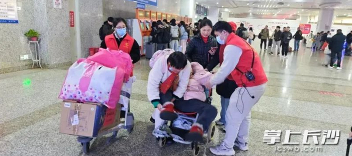 乘车当天,几位志愿者在公交车下客点翘首以盼。老人和孙女一出现,志愿者们立刻帮忙推轮椅、提行李,将祖孙俩安全送到重点旅客候车室。工作人员还准备了装有牛奶、水果、礼盒的爱心礼包,得知孙女需要卫生纸后,又立刻准备了一提。
