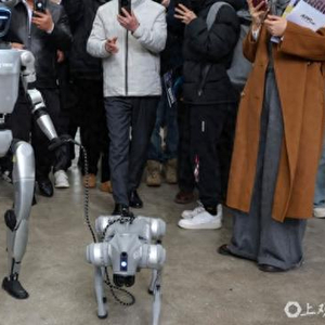 宇树人形机器人“遛狗”,引起观众围观。赖鑫琳 摄