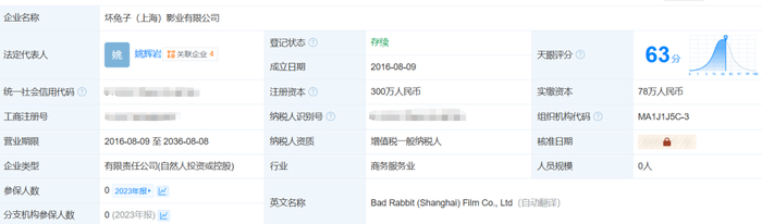 天眼查App显示,这家全名为“坏兔子(上海)影业有限公司”(以下简称“坏兔子”)的影视公司,成立于2016年8月,法定代表人为姚辉岩,监事为曹郁。该公司成立之初,公司的法定代表人为姚晨。