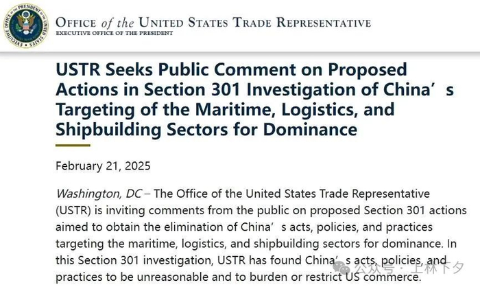 当地时间2025年2月21日,美国贸易代表办公室(USTR)发布通知,邀请公众就针对中国在海事、物流和造船业占据主导地位所展开的301条款拟议行动发表意见。据称,此次行动旨在消除中国相关领域的行为、政策和做法对美国商业造成的所谓负担或限制。美国贸易代表办公室(USTR)提出了一项提议:对与中国船舶运营商及中国建造船舶相关的国际海上运输服务实施费用征收与限制措施,并鼓励增加美国货物在美国船舶上的运输量。此提议是基于拜登政府先前对中国在海事、物流和造船等行业操作所开展的贸易调查结果,该调查在特朗普就职前四天即已完成,随后USTR于2月21日(星期五)正式公布了上述建议。美国贸易代表办公室提议对与中国船舶运营商和中国建造的船舶相关的国际海上运输服务征收费用和限制,限制措施如下:对中国船舶运营商收费:单航次进入美国港口时,收费最高可达100万美元。对拥有中国制造船舶的运营商收费:根据船队中中国制造船舶的比例,单航次进入美国港口收费最高可达150万美元。对订购中国船舶的运营商收费:根据从中国船厂订购船舶的比例,单航次进入美国港口收费最高可达100万美元。对美国建造船舶的服务费减免:使用美国建造船舶进行运输的运营商可获得一定费用减免。具体措施如下: