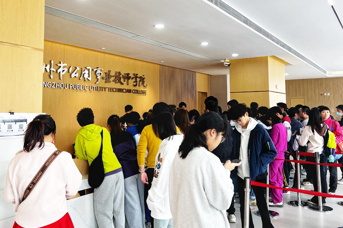 上午九时许,广州市公用事业技师学院已是人头攒动,招生就业处咨询台前更是排起长队,多位学生与家长手执招生宣传画册,咨询该校招生信息。