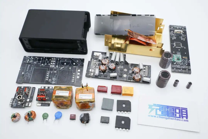 降压电路采用英集芯IP2738协议芯片搭配两路芯潭微NDP1460QB用于USB-C接口输出,USB-A接口采用英集芯IP6525S降压芯片。内部高压滤波电容来自永铭,输出滤波固态电容来自云星。PCBA模块元件通过导热垫接触到包裹的铝片散热,满足长时间满功率输出需求。