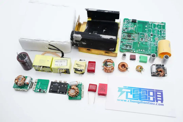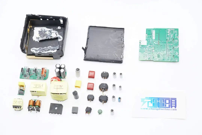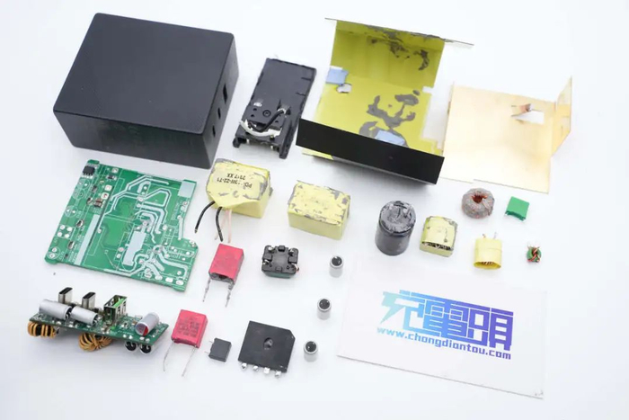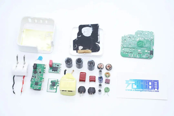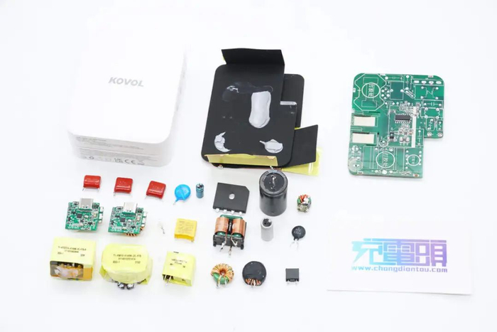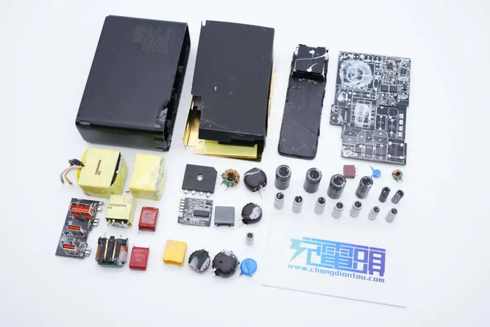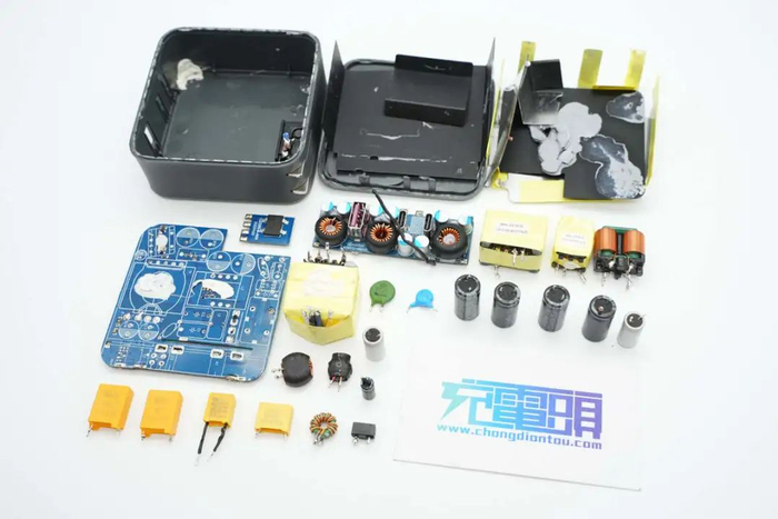 充电器高压滤波电容和固态滤波电容均来自万京源,PCBA模块采用导热胶灌封提升散热性能,并包裹铜箔屏蔽,PCBA模块开槽插入麦拉片绝缘,高压电解电容也设有硅胶帽绝缘,内部做工扎实,用料可靠。