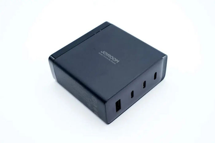 机乐堂这款氮化镓充电器为黑色方形设计,配有国标折叠插脚,便于日常携带与收纳。充电器具备3C1A接口,USB-C1接口支持140W输出,USB-C2接口支持100W输出,其余两个接口也支持快充,并支持功率自动分配,满足笔记本电脑,手机等多个设备同时充电使用。