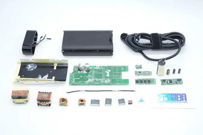 充电头网通过拆解了解到,惠普这款电源适配器由台达电子代工,PFC控制器为台达定制型号,HFB半桥控制器来自英飞凌,PFC开关管和同步整流管来自英飞凌,HFB半桥开关管和VBUS开关管来自士兰微。内部发热元件焊接在垂直小板上,打胶填充加强散热。PCBA模块整体包裹散热片,内部打胶填充提升散热性能,满足笔记本长时间大功率输出工况。