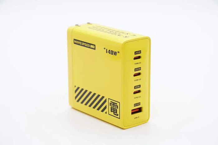 移速这款氮化镓充电器为熔岩黄配色,充电器为规整的方形外观,配有折叠插脚,便于日常携带与收纳。充电器具备3C1A接口,USB-C1接口支持140W输出,USB-C2接口支持100W输出,其余两个接口也支持快充,并支持功率自动分配,满足笔记本电脑,手机等多个设备同时充电使用。