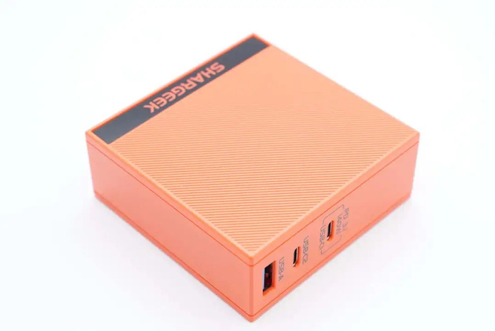 闪极140W充电器主色调为橙红色,机身采用方块造型设计,尖锐棱角风格得到延续,独特的几何美学让产品看上去更硬核。底部嵌有黑色亮面装饰板,中心设计有SHARGEEK品牌logo。