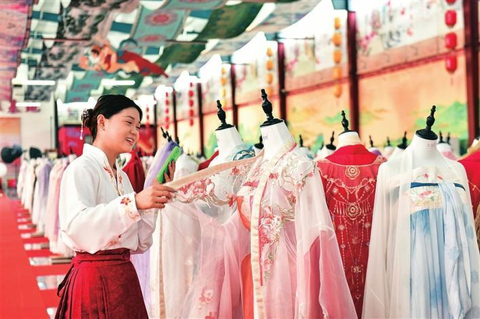 山东曹县瞄准“汉服经济”,挖掘细分赛道里的大市场,从“流量爆红”迈向“产业长红”。图为在山东曹县大集镇一家汉服基地,主播直播推介汉服。 新华社记者郭绪雷摄