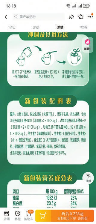 在电商平台上,记者发现有消费者购买的臻牧无蔗糖中老年羊奶粉标签前三位显示为“全脂羊乳粉、脱盐乳清粉、脱脂乳粉”,乳来源并非单一品种。针对这种情况,2月19日,臻牧官方旗舰店的客服人员告诉记者,新旧产品主要看生产日期,目前所售调制羊乳粉产品中执行新旧国标的产品都有。