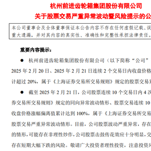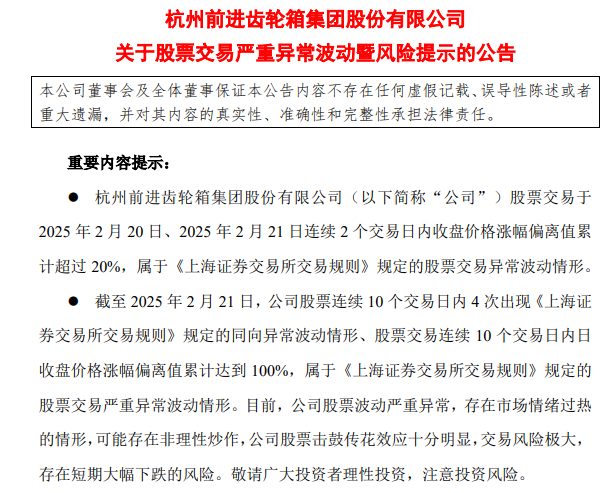 杭齿前进在上述公告中称,截至2025年2月21日,公司股票连续10个交易日内4次出现《上海证券交易所交易规则》规定的同向异常波动情形、股票交易连续10个交易日内日收盘价格涨幅偏离值累计达到100%,属于《上海证券交易所交易规则》规定的股票交易严重异常波动情形。目前,公司股票波动严重异常,存在市场情绪过热的情形,可能存在非理性炒作,公司股票击鼓传花效应十分明显,交易风险极大,存在短期大幅下跌的风险。敬请广大投资者理性投资,注意投资风险。