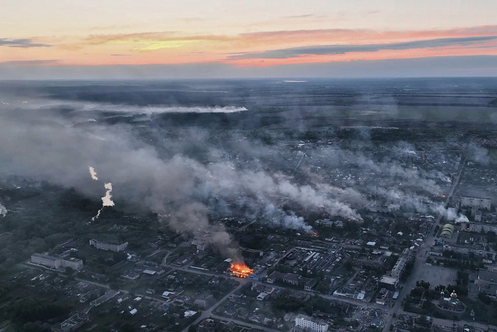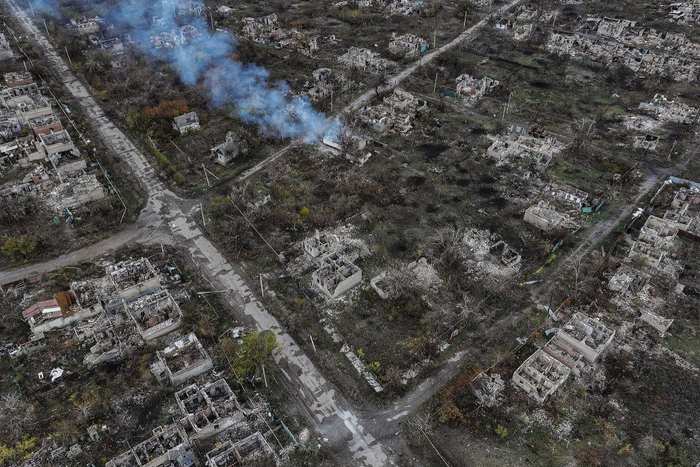 当地时间2024年11月11日,乌克兰顿涅茨克地区,查西夫亚尔的空中视角显示,经过俄乌激烈交战,这座前线城市已化为废墟。