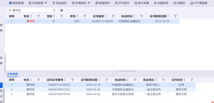 夏雨扬女士曾保荐了东方财富、东航物流、地素时尚、会稽山等IPO项目。