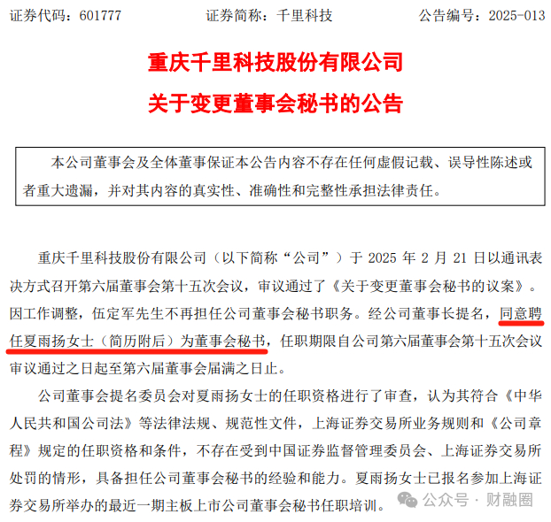 2月23日晚,上交所主板上市公司千里科技(601777.SH)公告变更董事会秘书。新任董秘夏雨扬曾任中国国际金融有限公司投资银行部董事总经理、保荐代表人,从事投行业务超20年。